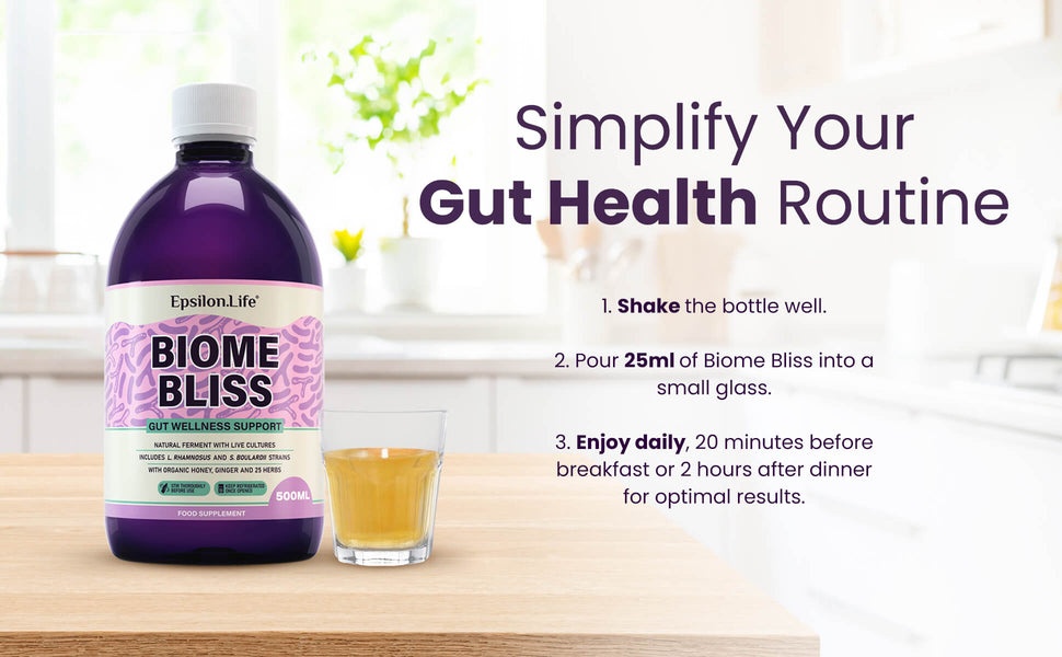 Adding Biome Bliss to your daily routine couldn't be simpler. Just shake the bottle well, pour 25ml into a small glass, and enjoy daily—preferably 20 minutes before breakfast or 2 hours after dinner for optimal absorption.